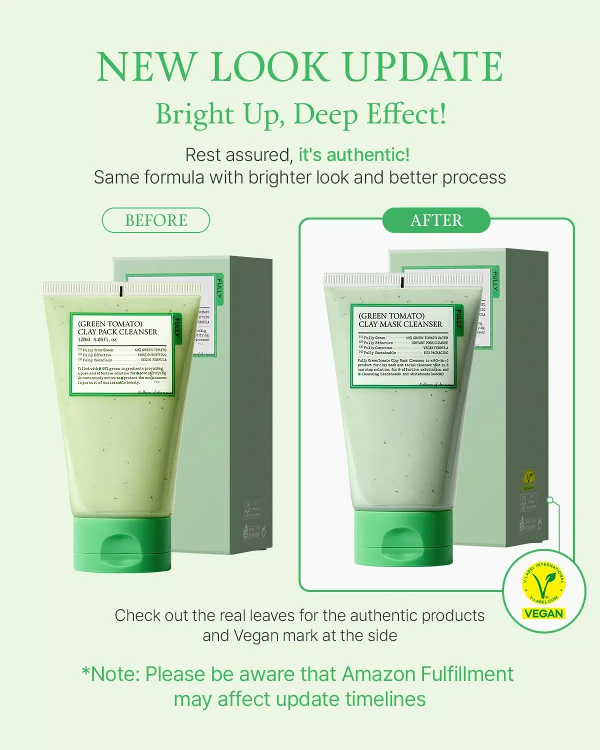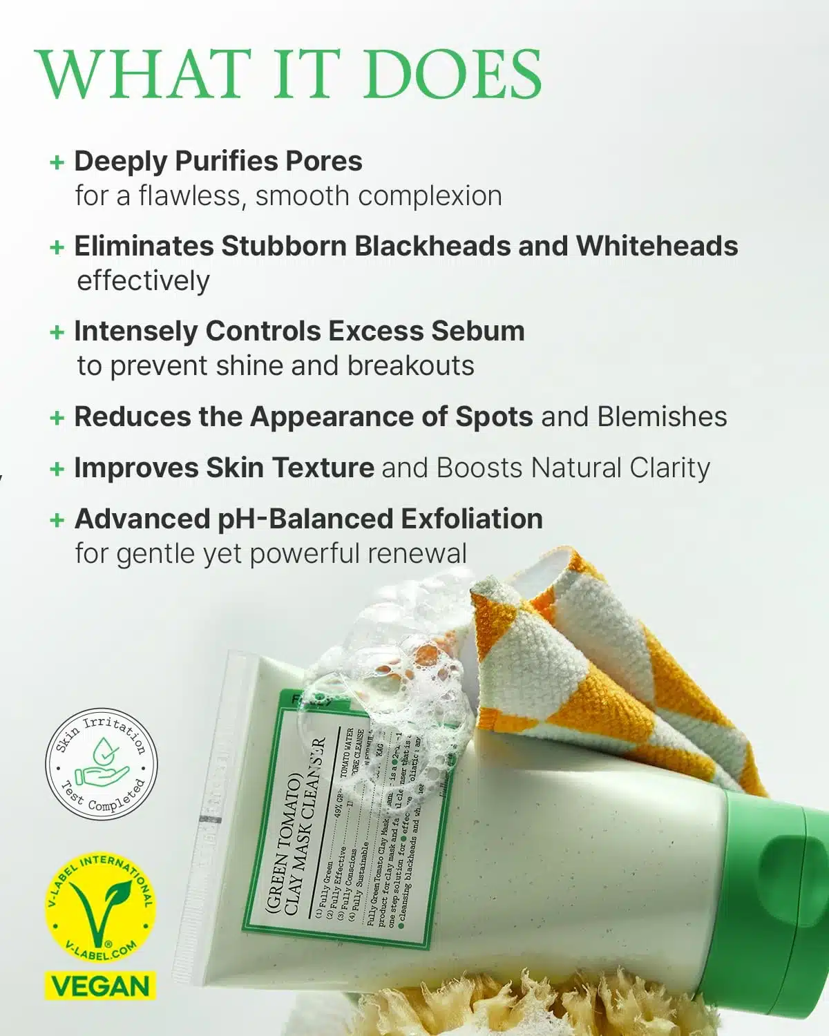 - A vegan clay mask cleanser contains 49% Green Tomato Extract that aids in deep exfoliation and helps control excessive sebum production.