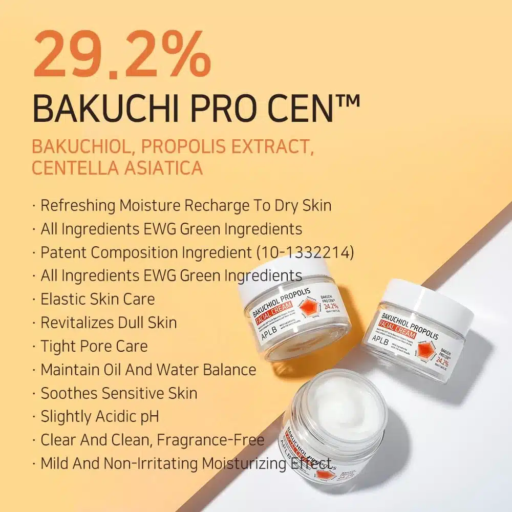 APLB Bakuchiol Propolis Facial Cream is a soothing moisturizer that targets signs of aging with the power of bakuchiol and propolis. Bakuchiol, a plant-based retinol alternative, helps reduce fine lines and wrinkles without irritation, while propolis deeply hydrates and protects the skin