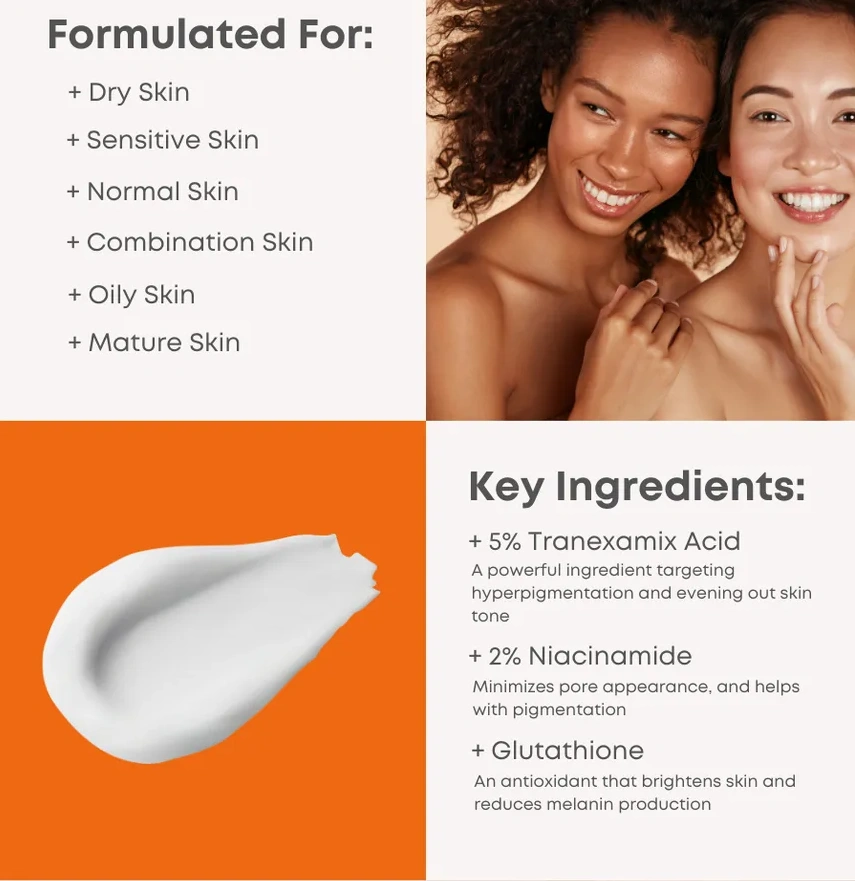 Water, Isopropyl Isostearate, Tranexamic Acid (50,490ppm), Butylene Glycol Dicaprylate/Dicaprate, Glycerin, Sorbitan Stearate, Triethylhexanoin, Cetylethylhexanoate, Pentylene Glycol, Niacinamide, Propylene Glycol, Magnesium Sulfate, Disteardimonium Hectorite, Caprylyl Glycol, Ethylhexylglycerin, Propanediol, Glutathione, Adenosine, Disodium EDTA, Ascorbic Acid, Eriobotrya Japonica Leaf Extract, 1,2-Hexanediol, Mentha Viridis (Spearmint) Extract, Arginine, Allantoin, Dipropylene Glycol